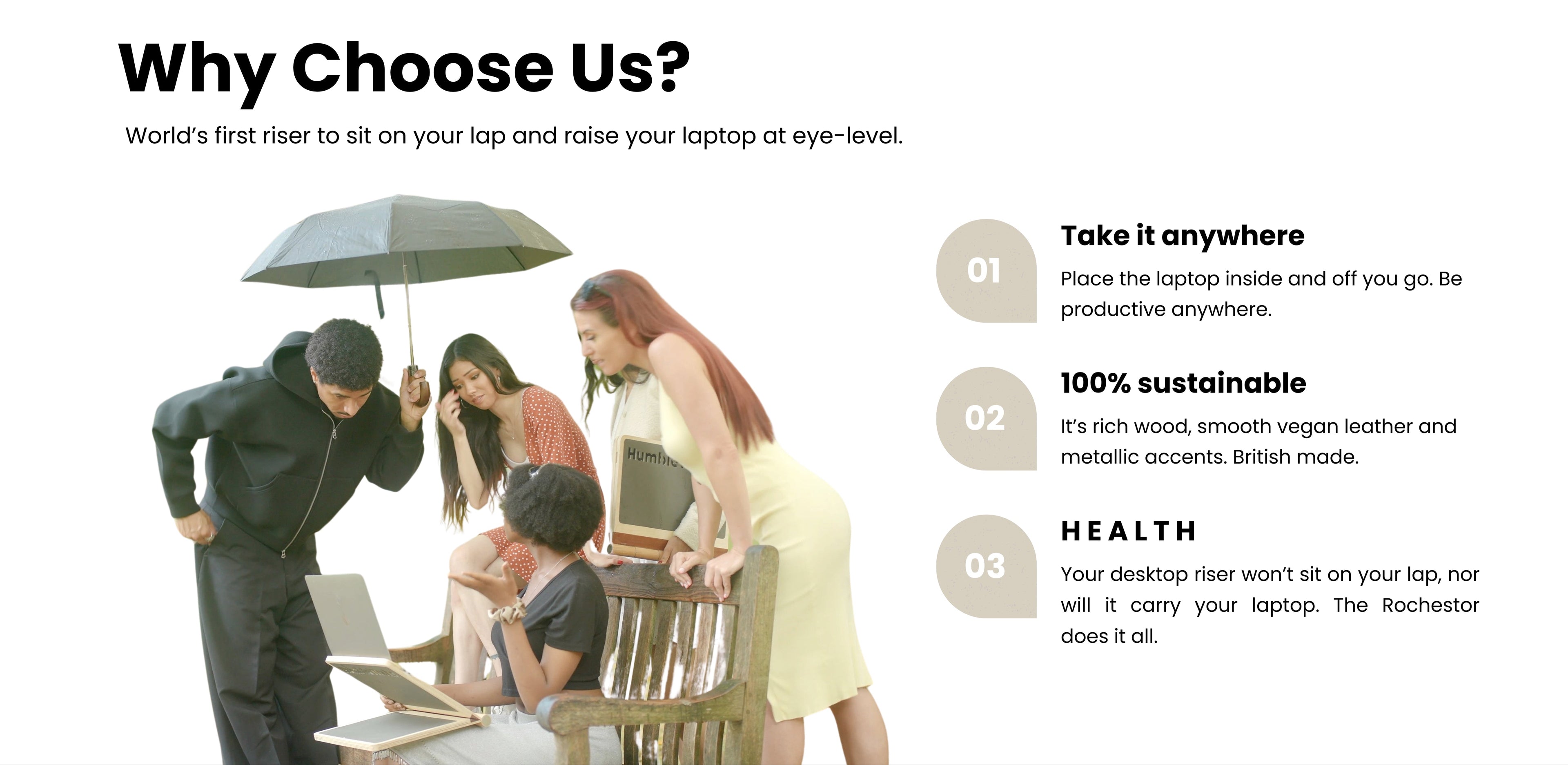The Rochestor is perfect for professionals seeking better posture, commuters needing stability on the move, and business travellers turning any space into a productive workstation. Its ergonomic design elevates laptops to eye level, reducing neck and shoulder strain.